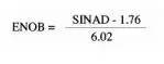 ENOB表示一个ADC在特定输入频率和采样率下的动态性能。理想ADC的误差仅包含量化噪声。当输入频率升高时,总体噪声(尤其是失真分量)也增大,因此降低ENOB和SINAD(参见“信号与噪声+失真比(SINAD)”)。满幅、正弦输入波形的ENOB由下式计算: