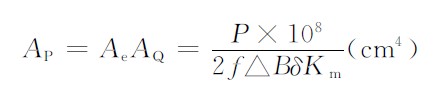 式中,P 为输入功率,单位W;f 为工作频率,单位Hz;△B 为工作磁通密度,单位GS;Km为窗口填充系数;δ为电流密度,单位A/cm2;△T 为开关管导通时间,单位s。